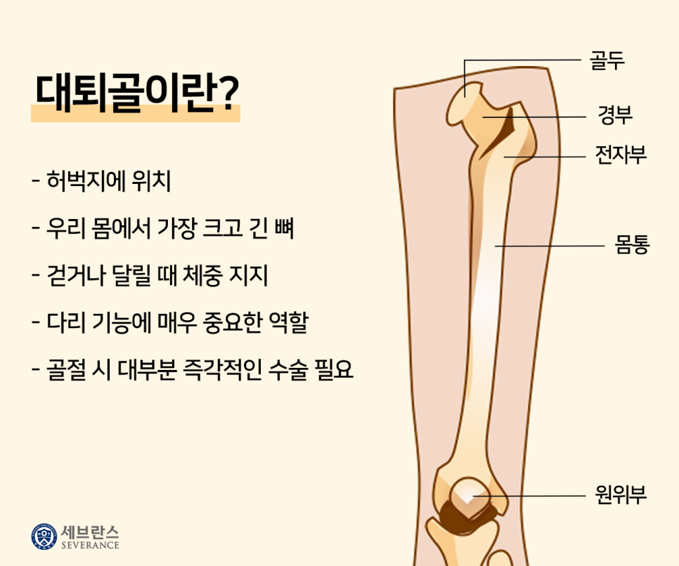 골다공증이 동반되어 뼈가 약한 고령의 환자에서는 낙상처럼 약한 힘으로도 비교적 흔하게 골절이 일어납니다. 가장 흔한 증상은 허벅지나 엉덩이의 심한 통증으로, 통증 때문에 혼자 일어서거나 움직이지 못한다면 대퇴골 골절을 의심해봐야 합니다.