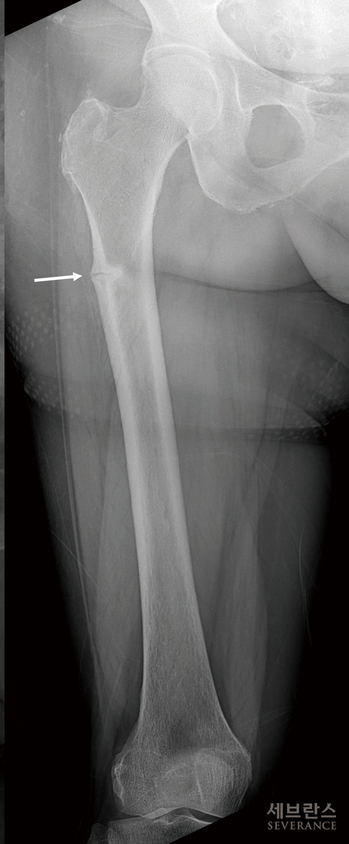 대퇴골 골절은 대개 외상에 의해 발생하지만, 골다공증 치료를 오래 지속한 고령 환자에서는 뚜렷한 외상 없이도 골절이 일어날 수 있습니다. 걷거나 움직일 때 같은 부위에 계속 통증이 나타나면서 수일간 지속된다면 대퇴골 골절을 의심해봐야 합니다.